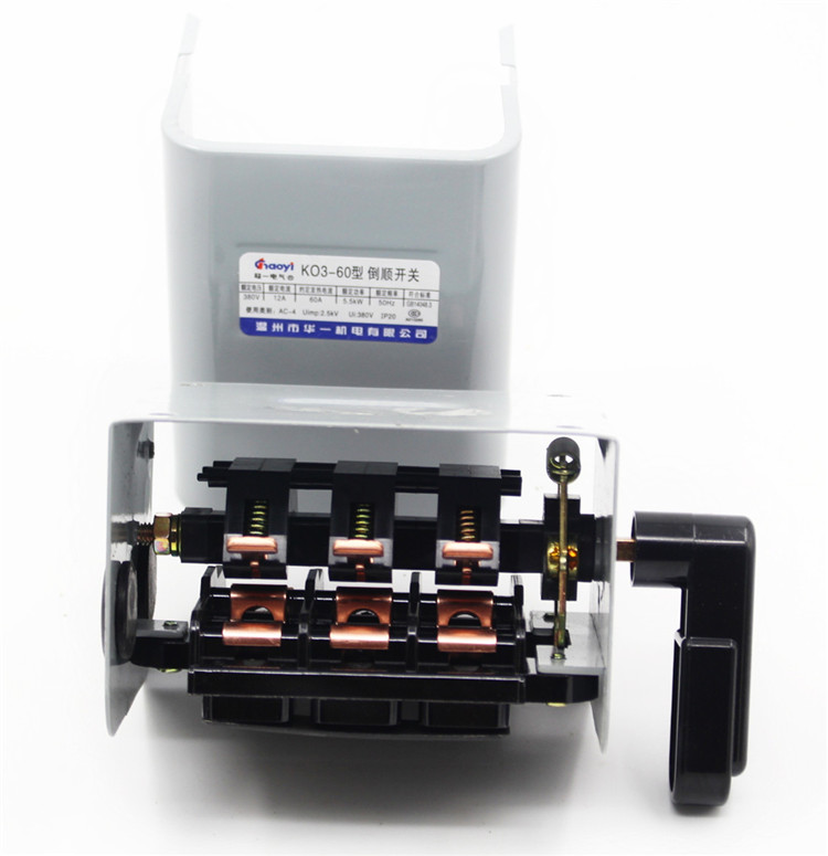 KO3-60A倒順開(kāi)關(guān)也叫順逆開(kāi)關(guān)。它的作用是連通、斷開(kāi)電源或負(fù)載,可以使電機(jī)正轉(zhuǎn)或反轉(zhuǎn),主要是給單相、三相電動(dòng)機(jī)做正反轉(zhuǎn)用的電氣元件,但不能作為自動(dòng)化元件。